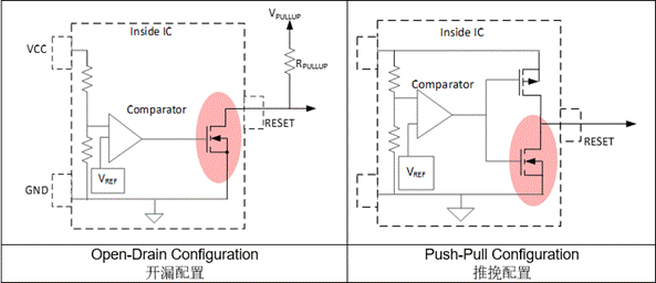 圖1、顯示了復(fù)位拓?fù)涞拈_漏配置和推挽配置