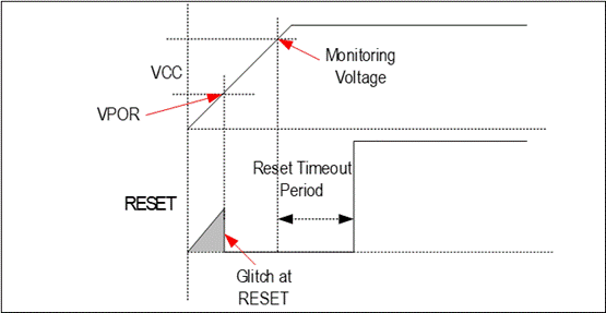 監(jiān)控器IC需要一個(gè)稱為上電復(fù)位(VPOR)的最低電壓來生成明確或可靠的復(fù)位信號,而在此最低電源電壓到來之前,復(fù)位信號的狀態(tài)是不確定的。一般來說,將其稱之為復(fù)位毛刺。
