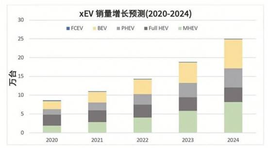 預期所有類型的電動車(xEV)的銷售在未來幾年將呈現(xiàn)加速增長,其中BEV和MHEV的增長最為強勁。