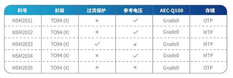 NSM203x產(chǎn)品系列包含了5個產(chǎn)品型號,即NSM2031、NSM2032、NSM2033、NSM2034和NSM2035?紤]過流保護(hù)輸出、參考電壓輸出、存儲器類型(單次可編程OTP、可重復(fù)編程MTP)、封裝形式等多個維度,NSM203x系列可以全面覆蓋各個應(yīng)用場景下的不同系統(tǒng)需求。各產(chǎn)品類型均有車規(guī)和工規(guī)型號,其中車規(guī)級別產(chǎn)品滿足AEC-Q100 Grade 0的可靠性要求,可在-40~150℃的嚴(yán)苛環(huán)境下勝任工作。