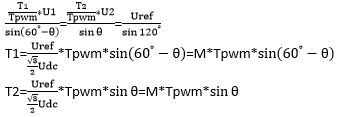 圖4為參考電壓在第一扇區(qū),有兩個(gè)非零矢量U1U2和零矢量合成,當(dāng)參考電壓進(jìn)入下一個(gè)扇區(qū),采用新的相鄰兩個(gè)矢量與零矢量進(jìn)行合成。基于矢量合成規(guī)則,在符合T1+T2 《= Tpwm條件下,并要求任意角度下V1和V2都能合成出的矢量,所以Uref_max=√3/2 Udc。調(diào)制度M=Uref/(Uref_max)=Uref/(√3/2 Udc)。