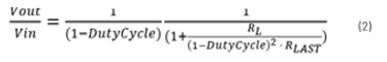 電壓增益較高時(shí),關(guān)閉時(shí)間可能不夠長(zhǎng),導(dǎo)致電感中暫時(shí)存儲(chǔ)的電能無(wú)法完全放電。因此,公式1中描述占空比的簡(jiǎn)化公式無(wú)法表述這種限制。只有同時(shí)考慮電感的直流電阻(DCR)和負(fù)載電阻時(shí),最大電壓增益公式才算成立。參見公式2: