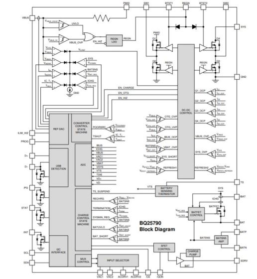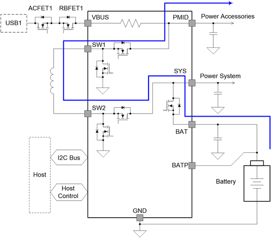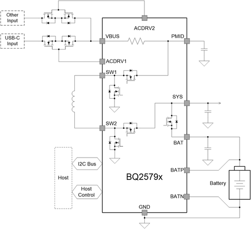 圖 3所示的完全集成的升降壓充電器可以簡化 USB PD 充電解決方案的系統(tǒng)范圍設(shè)計。作為輸入過壓和過流保護電路的一部分,外部背對背 MOSFET 的控制邏輯和驅(qū)動電路也集成到充電器中。這些功能消除了框圖中支持輸入電源路徑管理和輸入電流檢測的單元。