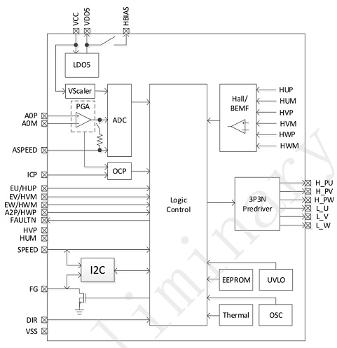 FT8215Q內(nèi)置多個(gè)功能模塊:系統(tǒng)時(shí)鐘(OSC)、ADC采樣、I2C通信、5V穩(wěn)壓(LDO)、電流采樣(VScaler)、過(guò)流保護(hù)(Over Current)、過(guò)溫保護(hù)(Thermal)等模塊。外置引腳有U/V/W驅(qū)動(dòng)輸出、SPEED/APSEED調(diào)速、FG輸出、正反轉(zhuǎn)DIR控制等。