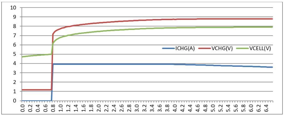 基于這個(gè)管理過程,使用充電芯片BQ24725A對(duì)一塊對(duì)講機(jī)電池(滿充電壓8.8V)進(jìn)行充電,并記錄下充電過程中的VCHG, ICHG和VCELL(電芯側(cè)的電壓)。下圖所示為基于橫坐標(biāo)的充電時(shí)間(分鐘)對(duì)應(yīng)的各個(gè)參數(shù)的變化趨勢(shì),可以看到在不到第五分鐘,VCHG就達(dá)到最大值,ICHG就從峰值的4A電流開始下降,經(jīng)歷了從CC區(qū)間到CV區(qū)間的切換。最大充電速率的CC階段4A充電持續(xù)時(shí)間很短,可以預(yù)料,如果要對(duì)這塊電池完全充滿,CV區(qū)間將耗費(fèi)很長(zhǎng)的時(shí)間。