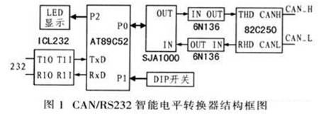 CAN/RS232智能電平轉(zhuǎn)換器硬件電路主要由微處理器AT89C52、獨立CAN通訊控制器SJAl000、CAN總線驅(qū)動器82C250、高速光電耦合器6N136、TTL電平與RS232電平轉(zhuǎn)換器ICL232、LED數(shù)碼管顯示電路以及為SJAl000提供初始地址的撥碼電路組成,其結(jié)構(gòu)框圖如圖1所示。