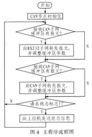 系統(tǒng)軟件程序設(shè)計包括:主程序、CAN節(jié)點初始化子程序、RS232報文發(fā)送子程序、RS232報文接收子程序、CAN報文接收子程序以及CAN報文發(fā)送子程序。其主程序流程圖如圖4所示。
