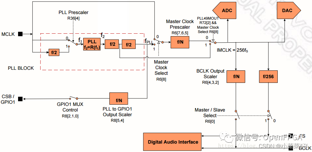 在I2S/PCM接口的ADC/DAC系統(tǒng)中,除了BCLK和FS(LRCLK)外,CODEC經(jīng)常還需要控制器提供MCLK (Master Clock),這是由CODEC內(nèi)部基于Delta-Sigma (ΔΣ)的架構(gòu)設(shè)計要求使然。MCLK時鐘頻率一般為256*FS,具體參考特定器件手冊。