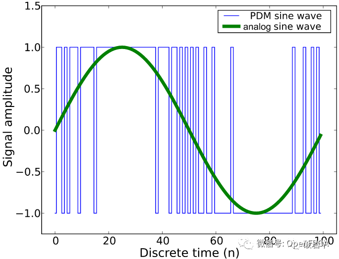在以PDM方式作為模數(shù)轉(zhuǎn)換方法的應(yīng)用接收端,需要用到抽取濾波器(Decimation Filter)將密密麻麻的0和1代表的密度分量轉(zhuǎn)換為幅值分量,而PCM方式得到的就已經(jīng)是幅值相關(guān)的數(shù)字分量。圖20示意為通過PDM方式數(shù)字化的正弦波。