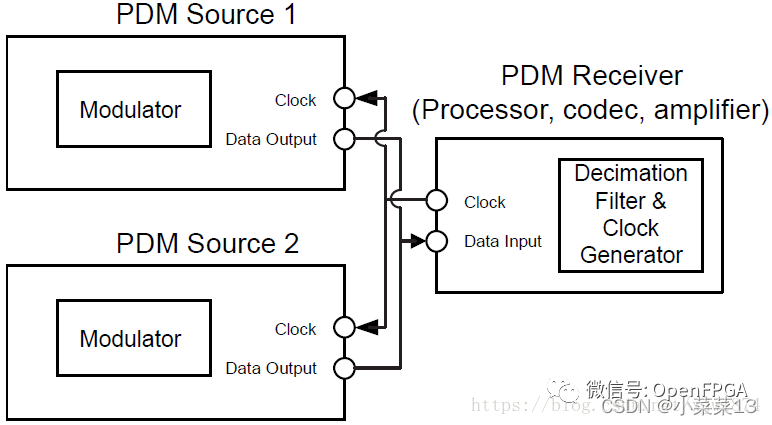 通過PDM接口方式,傳輸雙聲道數(shù)據(jù)只要用到兩根信號線。如圖21示意兩個PDM接口的發(fā)送設(shè)備與同一個接收設(shè)備的連接情況,比如Source 1/2分別作為左右聲道的麥克風,通過這種方式可以將采集到的雙聲道數(shù)據(jù)傳送到接收設(shè)備。主設(shè)備(此例中作為接收設(shè)備)為兩個從設(shè)備提供時鐘,分別在時鐘的上升沿和下降沿觸發(fā)選擇Source 1/2作為數(shù)據(jù)輸入。
