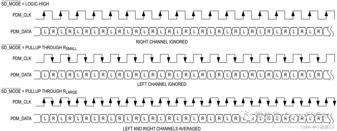 下圖為Maxim的Class-D類型功放MAX98358對PDM接口時序的要求,可以看到它在PDM_CLK的上升沿采樣左聲道數(shù)據(jù),在PDM_CLK下降沿采樣右聲道數(shù)據(jù)。、