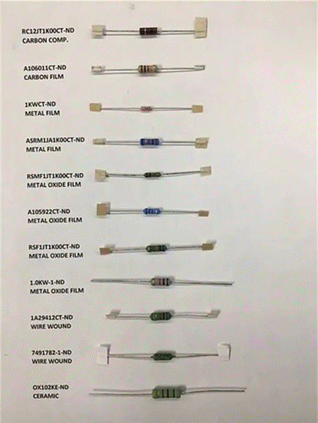 圖1:各種1KΩ電阻。即使不同電阻具有相似成分,但它們在功 率和電阻額定值之間可能存在的物理尺寸變化。