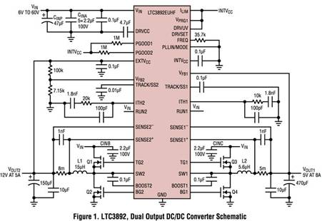 圖 1 顯示了單個 LTC3892、雙輸出解決方案:在 5A 時輸出 12V,在 8A 時輸出 5V。LTC3892 控制兩個電源系,每個都有一對開關(guān) MOSFET、電感器和輸出濾波器。該電路展示了通過對 V PRG1引腳進行編程將 V OUT1 設(shè)置為固定電平的能力 。在此示意圖中,它設(shè)置為 5V 1;因此,V OUT1 直接連接到 FB1 引腳。通過將 DRVSET 引腳連接到 INTV CC引腳來選擇標(biāo)準(zhǔn)柵極驅(qū)動電平 。
