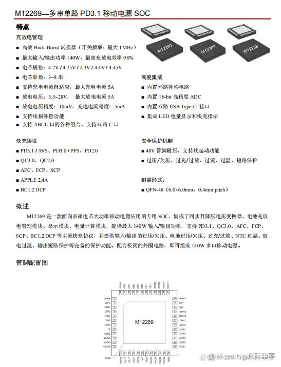 M12269 M12269是一款面向3-8串電芯大功率移動電源應(yīng)用的專用SOC,集成了同步升降壓電壓變換器、電池充放 電管理模塊、顯示模塊、電量計算模塊,提供最大 140W 輸入/輸出功率,支持 PD3.1、QC3.0、AFC、FCP、 SCP、BC1.2 DCP 等主流快充協(xié)議,并提供過壓/欠壓、過充/過放、過溫等完備的保護功能。配合簡單的外圍電路,即可組成大功率多口移動電源管理方案。 QFN-48 3.3V-28V 多串升降壓大功率移動電源 SOC