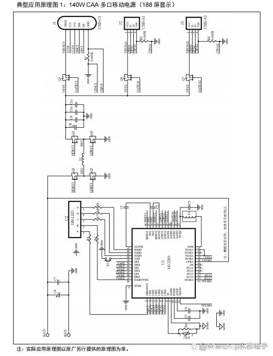 M12269作為水芯快充充放電平臺中的一款明星芯片,是面向多串電芯大功率移動電源和儲能應(yīng)用的專用SOC,集成了同步升降壓電壓變換器、驅(qū)動模塊、電池充放電管理模塊、顯示模塊、電量計算模塊,提供單C口最大140W輸入/輸出功率,支持PD3.1、QC3.0、AFC、FCP、SCP、BC1.2DCP等主流快充協(xié)議,并提供輸入/輸出的過壓/欠壓、電池過壓/欠壓、NTC高低溫、放電過流、短路保護等完備的保護功能。配合極簡的外圍電路,即可組成140W多口移動電源。