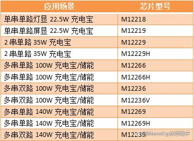 除了M12269這款明星產(chǎn)品外,MERCHIP水芯電子還推出了從22.5W-140W的完整快充充放電平臺。該系列芯片中的M12239等芯片可以支持兩路獨立快充,實現(xiàn)筆記本和手機同時快充。也可以多顆芯片并聯(lián)輕松實現(xiàn)多口快充充放電的復(fù)雜系統(tǒng)設(shè)計。該芯片家族包括以下成員:
