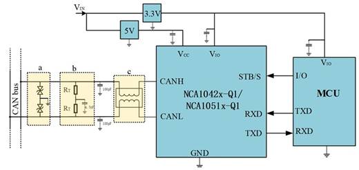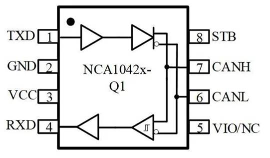 NCA1042B-Q1和NCA1051A-Q1 CAN收發(fā)器芯片邏輯I/O工作電平在2.8~5.5V范圍內(nèi),可支持3.3V和5V MCU 的I/O電平。