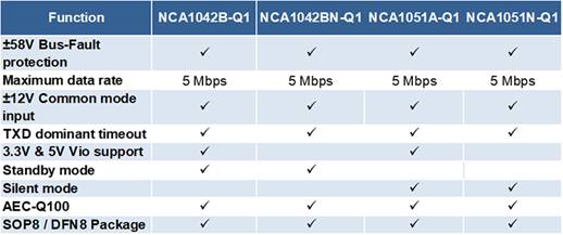 NCA1042x-Q1提供低電流的Standby模式,可以通過主控制器或者總線喚醒,NCA1051x-Q1提供低功耗的Silent 模式,并且兩者在斷電后都脫離總線;同時(shí),NCA1042x-Q1和NCA1051x-Q1 在normal mode下都具有TXD 超時(shí)功能,而NCA1042x-Q1在待機(jī)模式下還支持總線超時(shí)功能,兩者總線耐壓范圍在-58V~+58V之間,支持過溫和過流保護(hù)功能。