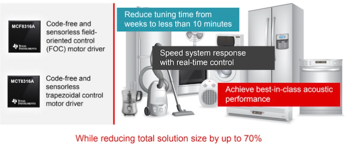 這些新芯片的目標包括三個方面:減少日常應用中的聲音噪聲源,將解決方案尺寸縮小70%,減少BLDC調諧的總體設計時間(可能減少到10分鐘)。