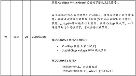 *TCOOLTHRS 0X14:使能CoolStep和StallGuard2功能的下限速度,到達此值電機停止并保持。