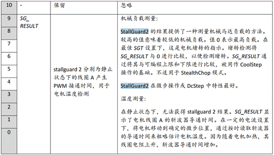 *DRV_STATUS 0X6F: StallGuard2值和驅動錯誤標志0-9bit SG_RESULT(負載值) 用于監(jiān)測電機所剩的扭力。