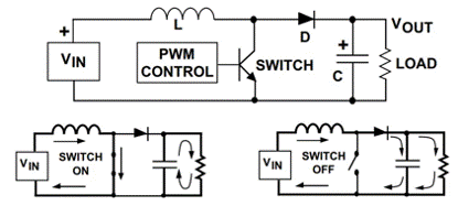在工作中,輸入電壓被連接到電感器,然后輸入和輸出電壓之間的差值被強(qiáng)制穿過(guò)電感器,使電流增加。在此過(guò)程中,電流同時(shí)流入負(fù)載和輸出電容,對(duì)電容進(jìn)行充電。當(dāng)開(kāi)關(guān)閉合時(shí),電容器向負(fù)載放電,使總電流(電感和電容器的電流之和)增加。
