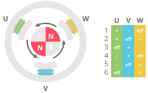 圖 1:BLDC 電機(jī)的 6 步換向模式:(圖片來(lái)源:CUI Devices)