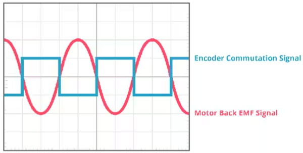 當(dāng)在電機(jī)上施加電流時(shí),電機(jī)會(huì)旋轉(zhuǎn),反之,當(dāng)旋轉(zhuǎn)電機(jī)時(shí),就會(huì)產(chǎn)生電流。如果旋轉(zhuǎn)無(wú)刷直流電動(dòng)機(jī),我們會(huì)看到 3 相的輸出與以下圖 2 所示類似。為使換向編碼器,甚至霍爾效應(yīng)傳感器與無(wú)刷直流電動(dòng)機(jī)正確對(duì)齊,所產(chǎn)生的換向波形應(yīng)與反電動(dòng)勢(shì)對(duì)齊。傳統(tǒng)上,這將導(dǎo)致一個(gè)反復(fù)過(guò)程,需要用第二臺(tái)電機(jī)來(lái)驅(qū)動(dòng)第一臺(tái)電機(jī),并需要用示波器觀察波形。這可能會(huì)耗費(fèi)時(shí)間,并增加大制造成本。