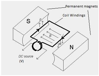 直流電機(jī): 簡(jiǎn)單的直流電機(jī)在軸上使用線(xiàn)圈繞組,帶有固定的永磁體(圖 2)。當(dāng)電壓 (V) 施加到線(xiàn)圈時(shí),電流 (i) 流過(guò)它。由于存在磁場(chǎng) (B),力 (F) 作用在線(xiàn)圈上(根據(jù)弗萊明斯右手定則),使其旋轉(zhuǎn)。一旦線(xiàn)圈到達(dá)永磁體的一個(gè)磁極,它就會(huì)受到排斥力并向另一個(gè)磁極移動(dòng)。這涉及連續(xù)旋轉(zhuǎn),其速度由施加的直流電壓決定。