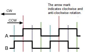 增量編碼器: 使用增量編碼器,只能確定電機(jī)的相對(duì)位置(即,只能確定相對(duì)于先前位置的旋轉(zhuǎn)方向和角度)。增量編碼器發(fā)出兩個(gè)信號(hào),A 和 B,當(dāng)沒(méi)有旋轉(zhuǎn)時(shí),這兩個(gè)信號(hào)都有一個(gè)默認(rèn)值,比如邏輯 0 或邏輯 1。當(dāng)軸上有一個(gè)小角度旋轉(zhuǎn)時(shí),信號(hào) A 和 B 都轉(zhuǎn)換為其他邏輯持續(xù)時(shí)間很短,然后返回到默認(rèn)值。對(duì)于每次這樣的旋轉(zhuǎn),A 和 B 信號(hào)都會(huì)發(fā)生轉(zhuǎn)換。根據(jù)旋轉(zhuǎn)方向,A 中的過(guò)渡會(huì)導(dǎo)致 B 中的過(guò)渡,反之亦然。圖 4 顯示了順時(shí)針和逆時(shí)針旋轉(zhuǎn)的 A 和 B 信號(hào)。