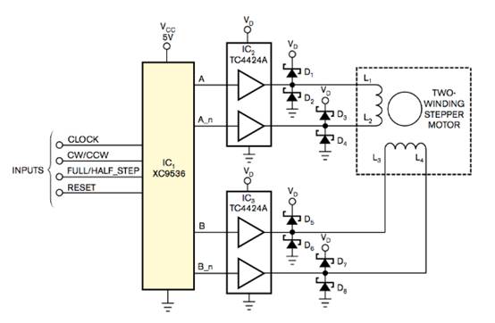 CPLD的輸出包括A相和A_n相以及B相和B_n相,每個相位通過外部電源驅動器IC控制電機的兩個線圈之一2 和集成電路3 ,在電機的標稱電壓(圖1 ).每個驅動器輸出端的一對肖特基二極管在通過反轉繞組電流引起的感性電壓瞬變期間保護驅動器的輸出。將 MOSFET 驅動器與內(nèi)部二極管配合使用,例如 微芯片的 TC4424A 雙驅動器,可省去對外部二極管的要求。