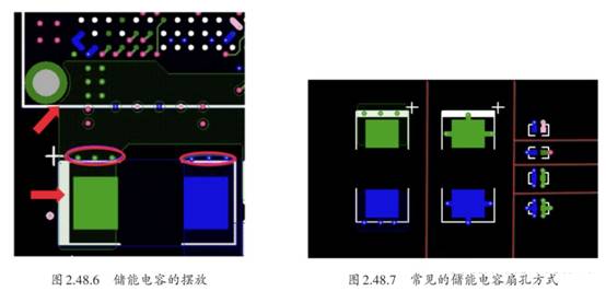 儲能電容的作用就是保證IC在用電時,能在最短的時間內(nèi)提供電能。儲能電容的容值一般比較 大,對應的封裝也比較大。在PCB中,儲能電容可以離器件遠一些,但也不能太遠,如圖2.48.6所示。常見的儲能電容扇孔方式,如圖2.48.7所示。