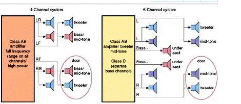 添加兩個(gè)通道可以解決幾個(gè)問(wèn)題。首先,它允許大功率低音揚(yáng)聲器通過(guò)兩個(gè)新通道獨(dú)立驅(qū)動(dòng)至汽車前排座椅下方的揚(yáng)聲器。消除門共振。更高的聲音保真度也是可能的,因?yàn)樗械膿P(yáng)聲器都沒(méi)有義務(wù)在整個(gè)頻率范圍內(nèi)工作。
