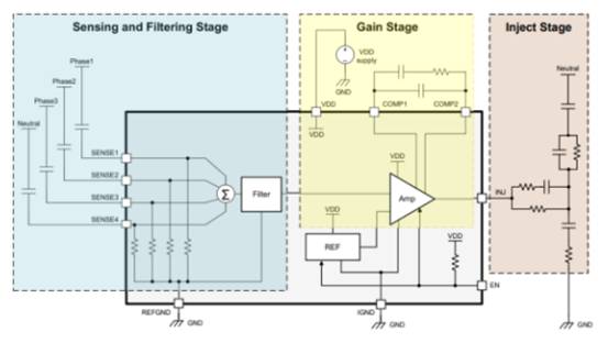 TI的獨立式有源EMI濾波器IC的工作原理為,先檢測共模噪聲,然后通過內部運放輸出反向并放大的信號,然后將其注入到線路中,相當于放大了Y電容的等效電容,從而抵消原有的共模噪聲。Roja de Cande表示:“這既能夠有效減小漏電流,同時也能夠放大 100kHz 至 3MHz 的等效 Y 電容,進一步降低整個共模電感的感量,從而降低方案的體積和重量!