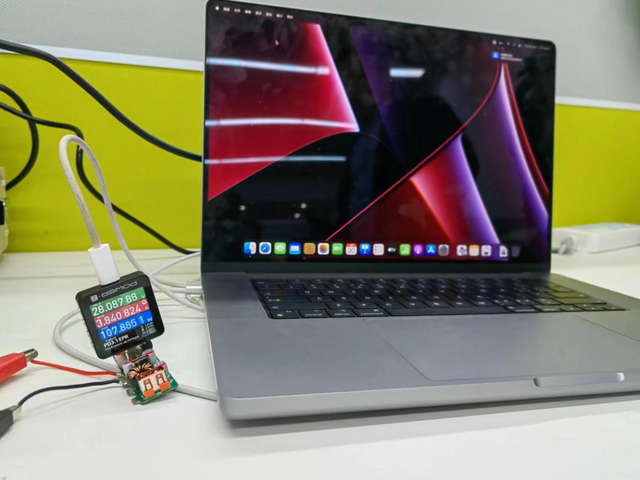 C1插入蘋果筆記本,C2口插入蘋果13,C1口輸出功率100W,C2口最大輸出功率18W。