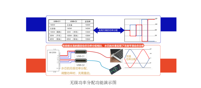 由此可以看出來,M12359的“無級功率分配”功能,實現(xiàn)了任意單口輸出均可滿功率、多口同時工作時可以智能分配功率并最大化利用充電器功率為用電設備充電。
