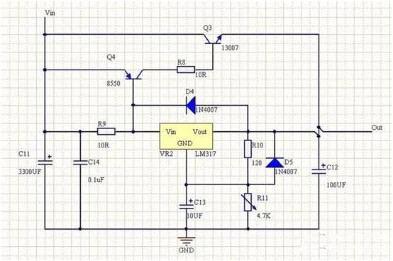 4、也可以使用LM317線性可調(diào)三端穩(wěn)壓器實(shí)現(xiàn)。其輸出電流1.5A,若電流不夠時(shí),可以使用三極管進(jìn)行擴(kuò)流,其原理如下圖所示。