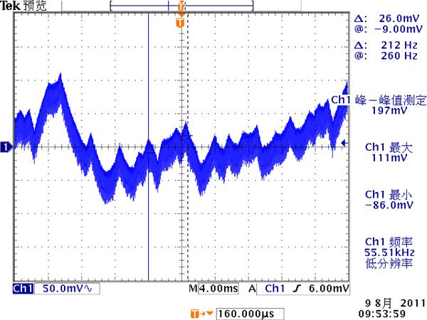 低頻紋波是與輸出電路的濾波電容容量相關(guān)。由于開(kāi)關(guān)電源體積的限制,電解電容的容量不可能無(wú)限制地增加,導(dǎo)致輸出低頻紋波的殘留,該輸出紋波頻率隨整流電路方式的不同而不同。
