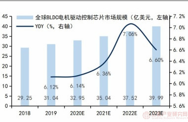 BLDC電機驅(qū)動控制芯片市場有望在2023年達到40億美元。受益于BLDC電機的性能優(yōu)勢,BLDC電機驅(qū)動控制芯片已廣泛應(yīng)用于各行各業(yè)中,以日本電產(chǎn)最近5個會計年度毛利率平均數(shù)23.82%作為BLDC毛利率計算,其成本規(guī)模為全球BLDC電機市場規(guī)!(1-BLDC毛利率),驅(qū)動控制類芯片成本占比按照25%估算,2018年全球BLDC電機驅(qū)動控制芯片市場規(guī)模29.25億美元,2023年全球BLDC電機驅(qū)動控制芯片市場規(guī)模接近40億美元。