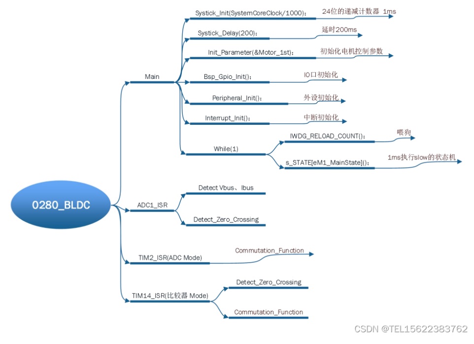 由圖可知,系統(tǒng)上電復(fù)位后,先執(zhí)行一段延時函數(shù),等待系統(tǒng)穩(wěn)定后開始初始化系統(tǒng)外設(shè) 及參數(shù),最后使能對應(yīng)的中斷,在 while 循環(huán)中執(zhí)行喂狗及 1ms 一次的慢速環(huán)狀態(tài)機(jī)。 1) ADC 法檢測過零點(diǎn)時,在 ADC1 中斷執(zhí)行過零點(diǎn)檢測,在 TIM2 中執(zhí)行延時和換相。 2) 比較器法檢測過零點(diǎn)時,在 TIM14 中斷執(zhí)行過零點(diǎn)檢測,并執(zhí)行延時和換相。