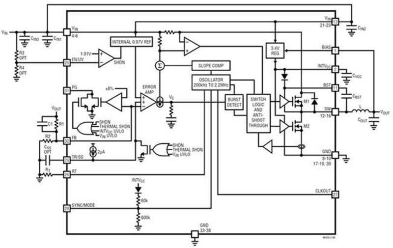 圖 1:Silent Switcher 降壓穩(wěn)壓器的方框圖展示了它們的復雜度,但無法顯示用于實現重大性能改進的技術細節(jié)。(圖片來源:Analog Devices)