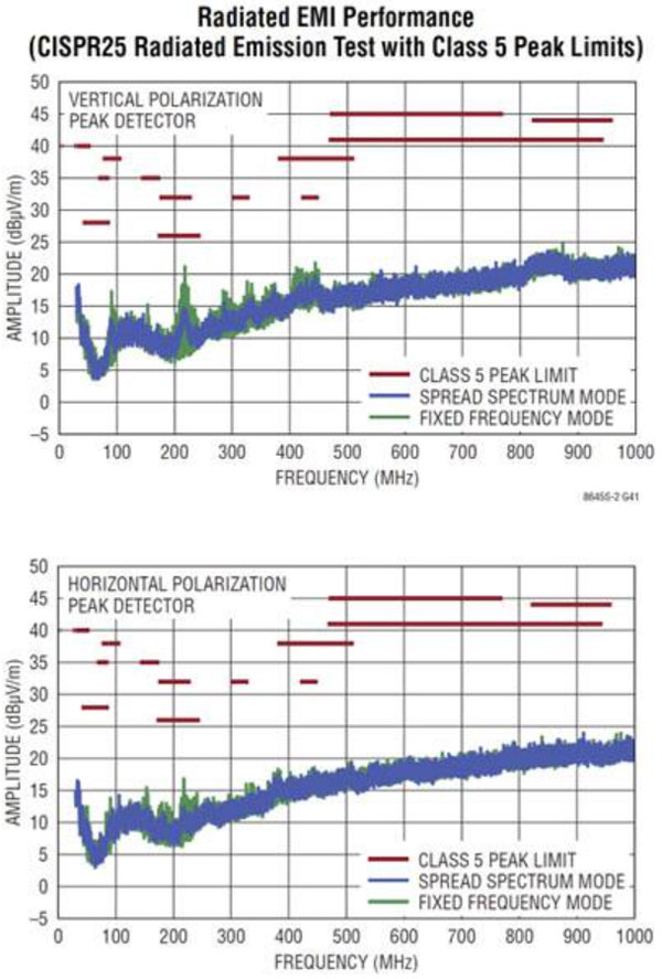 為了抑制熱回路,Silent Switcher 設計將熱回路分為兩個均衡回路,使得它們的電流可以有效地相互抵消。為了解決走線電感問題,在芯片上集成旁路電容器,避免與印刷電路板走線電感和瞬時振蕩有關的問題,同時通過消除外部元器件及其貼裝的可變性確保性能。這種做法讓輻射放射性能能夠輕松達到 CISPR 25 標準限值(圖 3)。