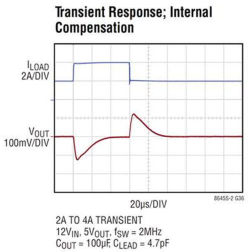 這些開關穩(wěn)壓器的設計還能夠改進瞬態(tài)響應。它們提供清晰、精密的調節(jié)(盡管負載變化),并可在各種不同工作條件下保持回路穩(wěn)定性(圖 4)。為了增加靈活性,LT8646S 器件還允許外部電阻-電容器 (RC) 補償,讓設計人員能夠優(yōu)化瞬態(tài)響應。