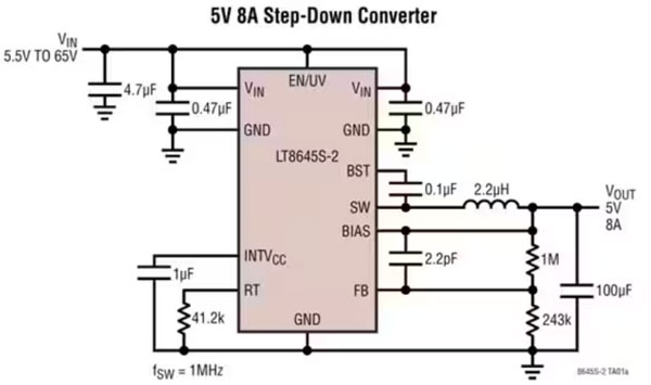 但是,隨著最近的技術進步和創(chuàng)新拓撲結構的問世,這種情況已經改變,LT8645S、LT8646S 和 LT8645S-2 就證明了這一點。這三款相似的 65 V 單片 Silent Switcher 同步降壓穩(wěn)壓器來自于 Analog Devices,每款穩(wěn)壓器都能夠支持 8 A 輸出(圖 1)。