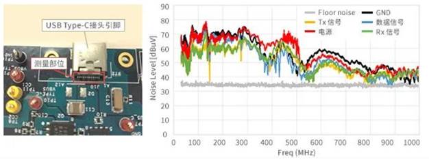 對傳導(dǎo)至測試基板的USB Type-C接頭引腳的噪聲進(jìn)行測量,從測量結(jié)果可以確認(rèn),電源線和GND線的噪聲電平在100至300MHz的范圍內(nèi)較高。