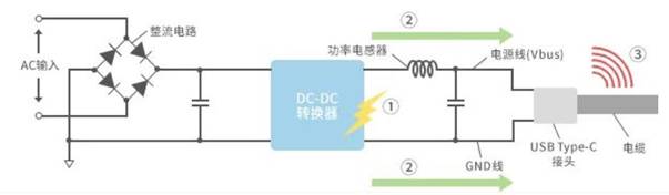 由于支持USB Power Delivery的大功率充電器具有較大的供電電流值,因此DC-DC轉(zhuǎn)換器的開關(guān)噪聲往往比以前的USB充電器更大。
