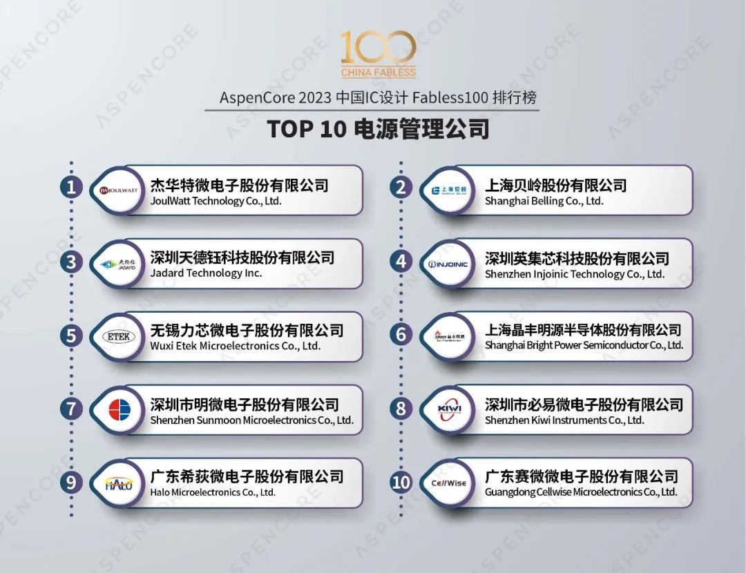 入選2023年中國IC設(shè)計Fabless100排行榜的Top 10 電源管理芯片(PMIC)公司
