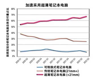在工作環(huán)境中,人們使用筆記本電腦的方式不斷發(fā)生意想不到的變化。疫情使得遠(yuǎn)程辦公已成為一種常態(tài)化。而在各種遠(yuǎn)程位置的混合辦公環(huán)境這一趨勢則推動了對便攜性和更佳音頻體驗的更高偏好。根據(jù) IDC PCD Tracker Historical 2022年第三季度報告(圖1所示),行業(yè)正在加速采用超薄筆記本電腦。