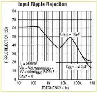 任何一款LDO都有一項(xiàng)指標(biāo):噪音抑制比。是一條頻率-dB曲線,如右圖是凌特公司LT3024的曲線。