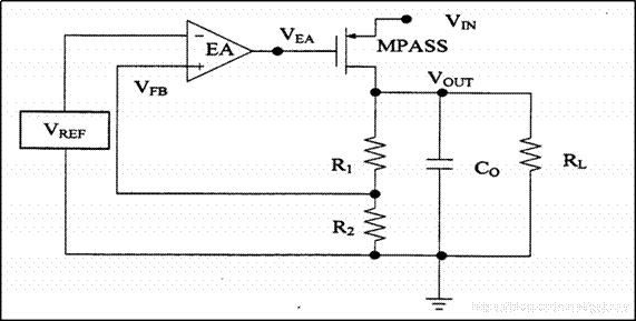 如今的LDO電路具有體積小,噪聲低,功耗低,價格低廉,使用方便等特點,但其基本的結(jié)構(gòu)比較簡單,包含了電壓基準源(VREF),誤差放大器(EA),調(diào)整管(MPASS),反饋電阻(Rl,R2)四個模塊,如下圖所示。其中:
